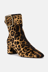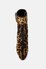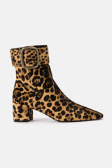 Bottes Saint Laurent marron et noires en cuir de veau, à bout pointu, imprimé léopard, effet poney, fermeture latérale zippée dissimulée et boucle ajustable.