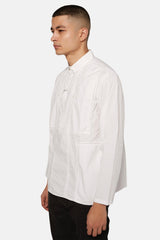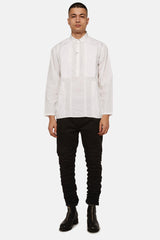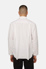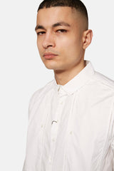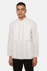 Chemise Rajesh Pratap Singh blanche en coton, à col en pointe, détail de sûrpiqures ton-sur-ton, poches poitrine boutonnées, patte de boutonnage et poignets boutonnés.