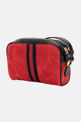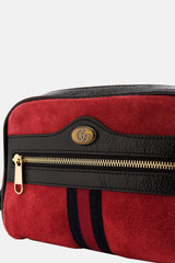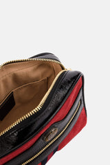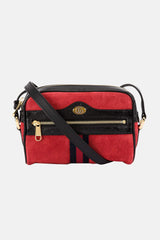 Sac Gucci rouge, noir et bleu marine en cuir, à bande Web, bandoulière ajustable, fermeture zippée, poche avant zippée, poche intérieure plaquée et mousqueton intérieur. Le sac possède une finition dorée.